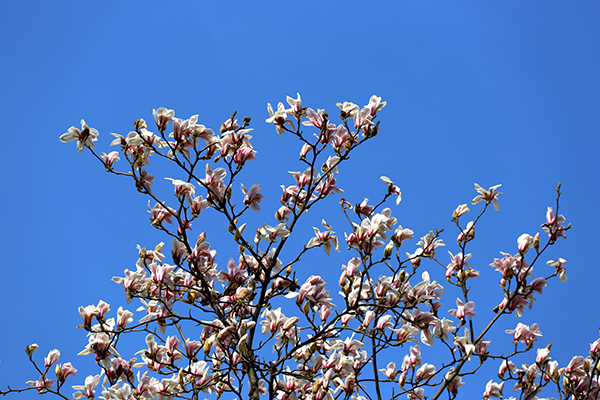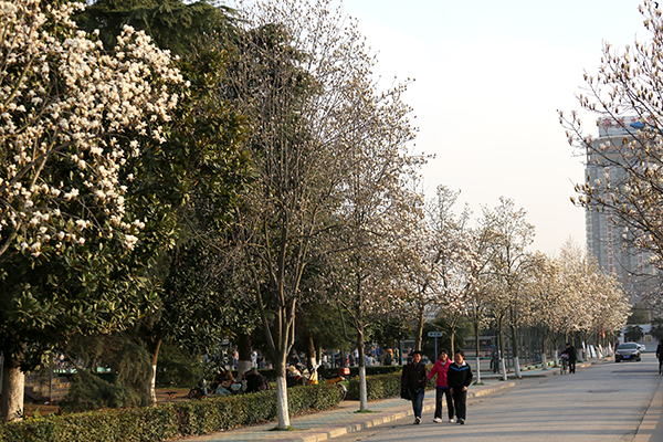 沿著校園的主干道,兩旁筆挺的玉蘭,亦耐不住春日的召喚。綿苞乍褪,鶴翅初批,暗香浮動,花滿枝椏,粉的艷如胭脂,白的潔如冬雪;蛟S美麗總是短暫的,數(shù)天光景,春雨走過,留下一地潔白。零落成泥,香卻如故。
