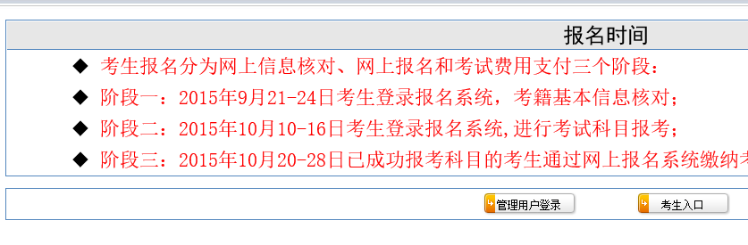 ◆ 階段二:2015年10月10-16日考生登錄報名系統(tǒng),進(jìn)行考試科目報考;
