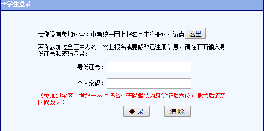 若你參加過全區(qū)中考統(tǒng)一網(wǎng)上報名或要修改已注冊信息,請在下面輸入身份證號和密碼登錄: