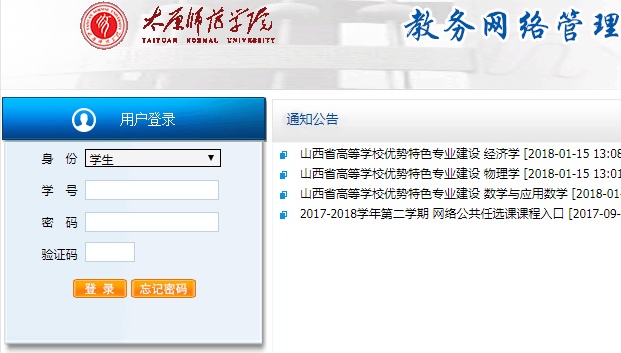 2017-2018學年第二學期 網(wǎng)絡(luò)公共任選課課程入口 [2017-09-18 12:22:18] 太原師范學院教務(wù)網(wǎng)絡(luò)管理系統(tǒng)登錄