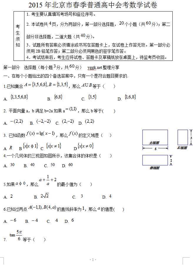 北京市2015年春季普通高中會考數(shù)學試卷及答案