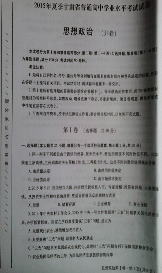 甘肅省2015年夏季高中學(xué)業(yè)水平考試思想品德試題(掃描版)