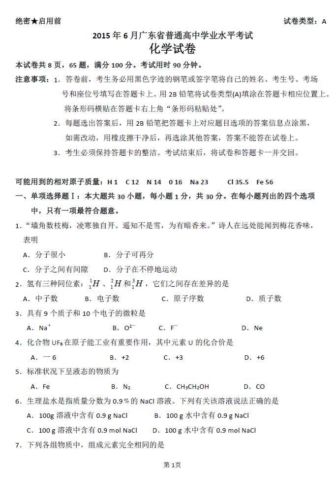 2015年6月廣東省普通高中學(xué)業(yè)水平考試化學(xué)試題及答案