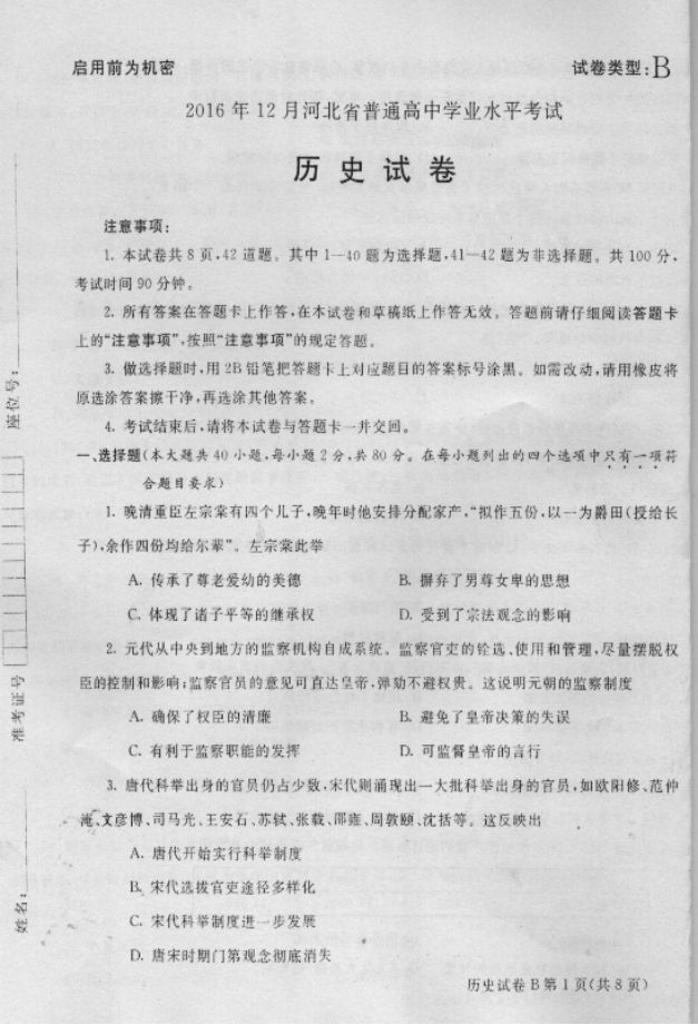 河北省普通高中2016年12月學(xué)業(yè)水平考試歷史試題