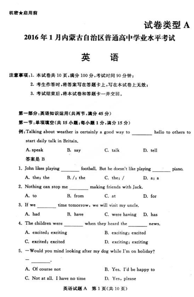 內(nèi)蒙古2016年1月普通高中學(xué)業(yè)水平考試英語試題及答案