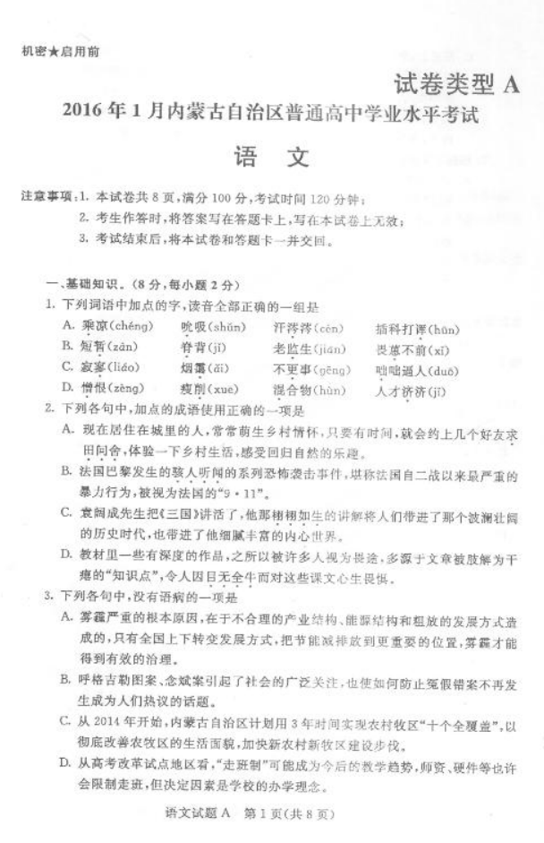 內(nèi)蒙古2016年1月普通高中學(xué)業(yè)水平考試語文試題及答案