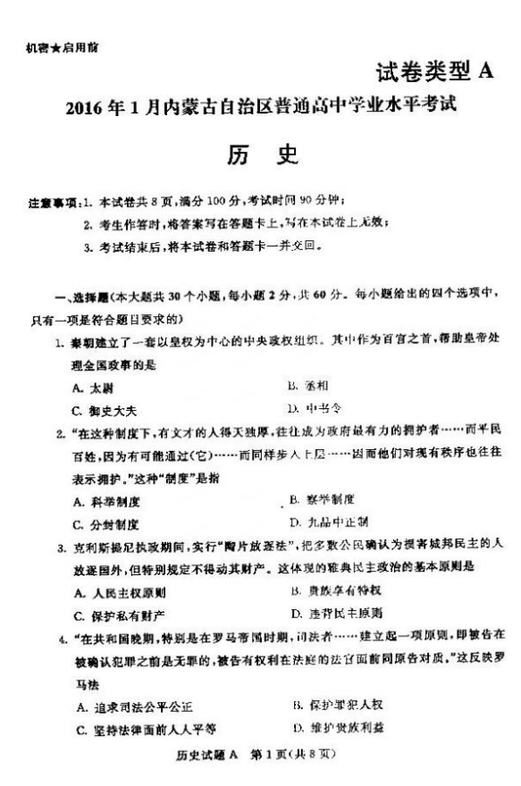 內(nèi)蒙古自治區(qū)2016年1月普通高中學(xué)業(yè)水平考試歷史試題及答案