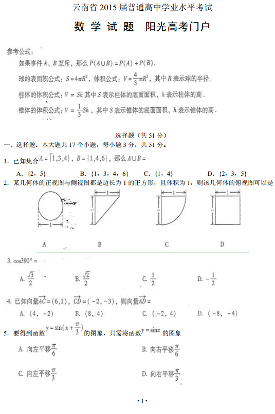 云南省2015年1月普通高中學(xué)業(yè)水平考試數(shù)學(xué)試題及答案