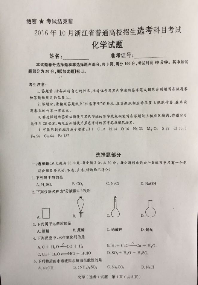 浙江省2016年10月普通高校招生選考科目考試化學(xué)試題