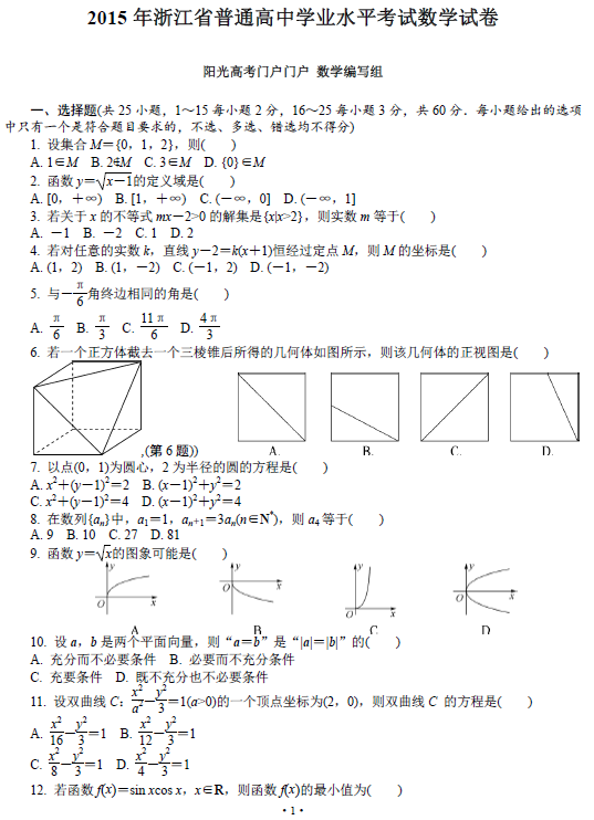 浙江省2015年1月普通高中學(xué)業(yè)水平考試數(shù)學(xué)試題及答案